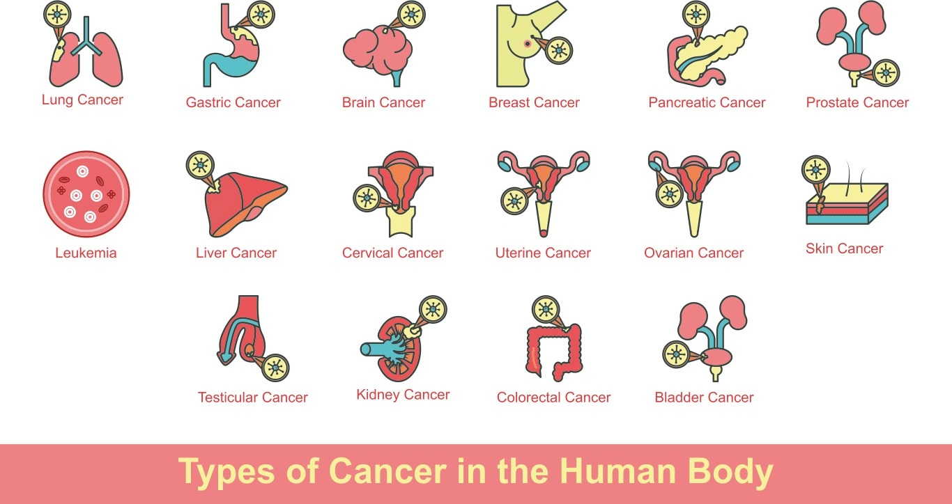 Over 200 different types of cancer are classified based on the organs where they develop. These include lung, breast, colorectal, prostate, skin, and blood cancers, among others.
