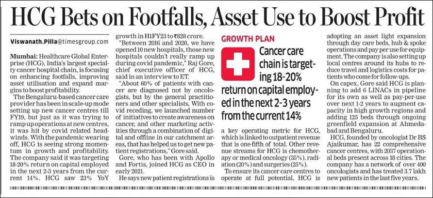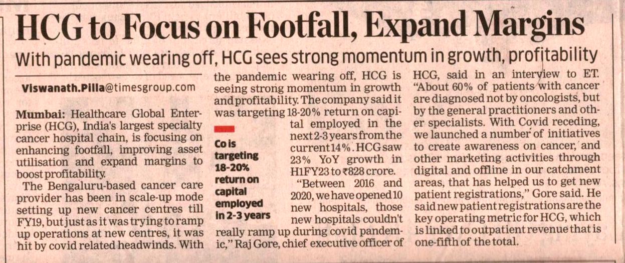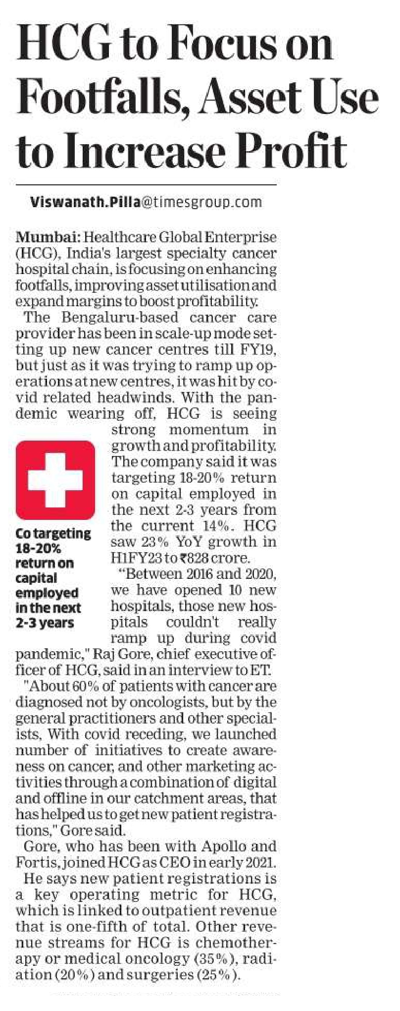The interview highlights on Healthcare Global Enterprise (HCG), India's largest specialty cancer hospital chain, focusing on enhancing footfalls, improving asset utilization and expand margins to boost profitability. The Bengaluru-based cancer care provider has been in scale-up mode setting up new cancer centers till FY19, but just as it was trying to ramp up operations at new centers, it was hit by covid related headwinds. With the pandemic wearing off, HCG is seeing strong momentum in growth and profitability. The company said it was targeting 18-20% return on capital employed in the next 2-3 years from the current 14%. HCG saw 23% YoY growth in H1FY23 to ?828 crore.